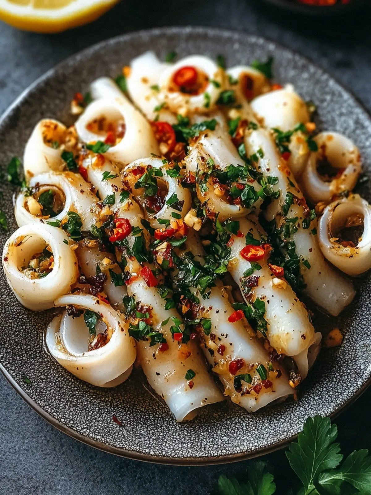 - Finish by squeezing fresh lemon juice over the squid, allowing the acidity to cut through the richness of the oil and the sweetness of the garlic. The citrus will brighten every bite and bring the dish together like a well‑tuned orchestra. Plate with confidence and watch your guests’ eyes light up.